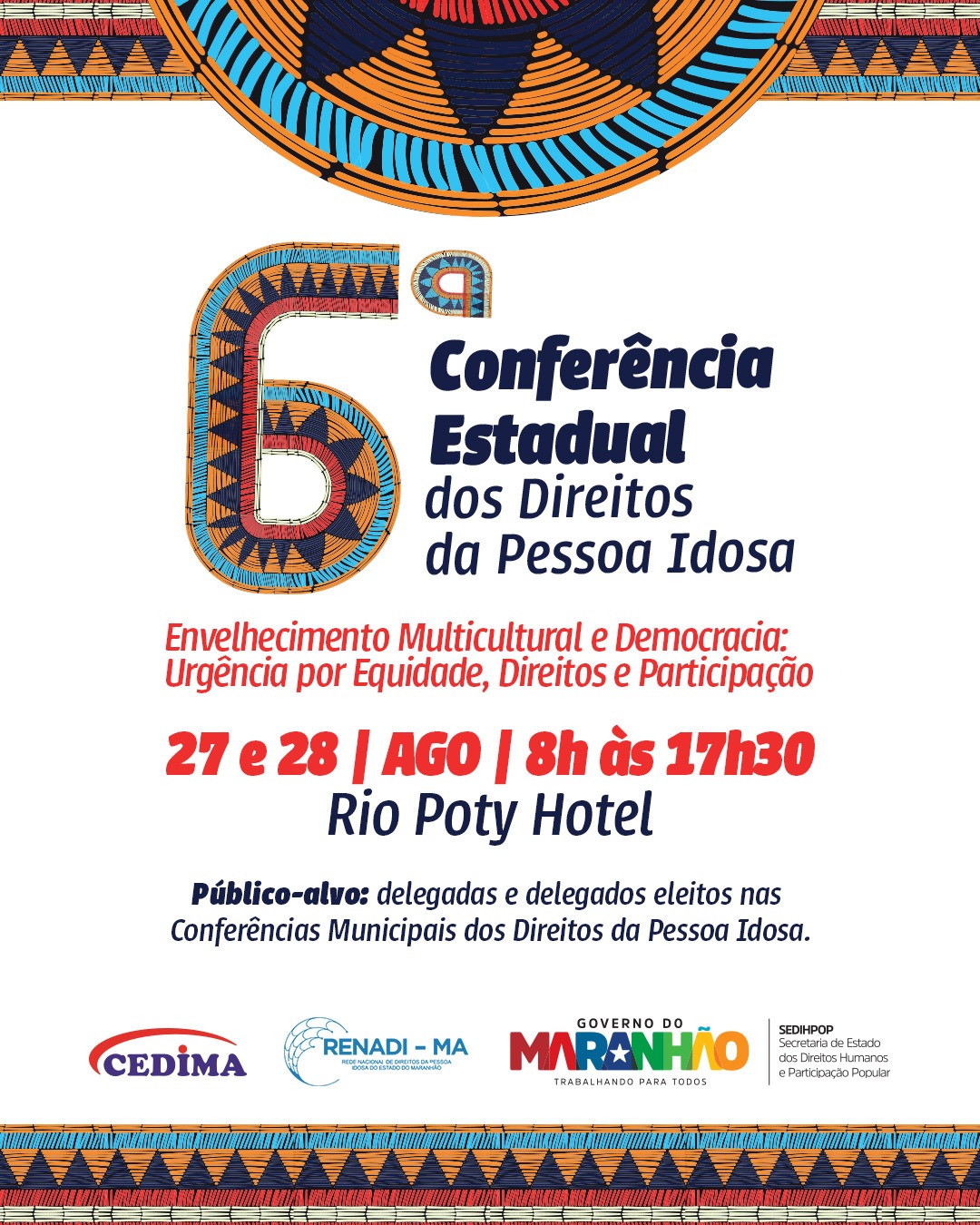 Para debater o tema “Envelhecimento Multicultural e Democracia: Urgência por Equidade, Direitos e Participação”, o Conselho Estadual dos Direitos do Idoso do Maranhão (Cedima), em parceria com a Secretaria de Estado dos Direitos Humanos e Participação Popular (Sedihpop), promove em São Luís a 6ª Conferência Estadual dos Direitos da Pessoa Idosa – COEDIPI, que acontecerá nos dias 27 e 28 de agosto, no Rio Poty Hotel (Av. dos Holandeses, Quadra 32, Ponta d’Areia).