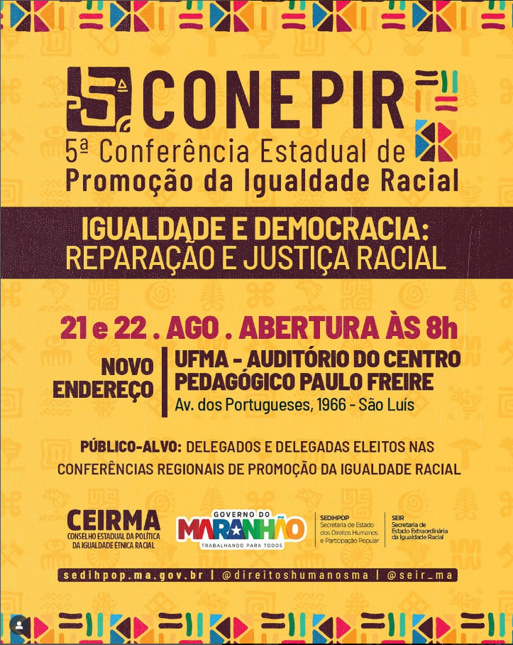 A conferência estadual é organizada pelo Conselho Estadual da Política de Igualdade Étnico-Racial do Maranhão (Ceirma), com apoio das secretarias de Estado dos Direitos Humanos e Participação Popular (Sedihpop) e da Igualdade Racial (Seir). Esta é a etapa preparatória para a 5ª Conferência Nacional de Promoção da Igualdade Racial (CONEPIR) que reunirá delegadas e delegados eleitos nas etapas regionais em São Luís, Itapecuru-Mirim, Pinheiro, Viana e Codó.