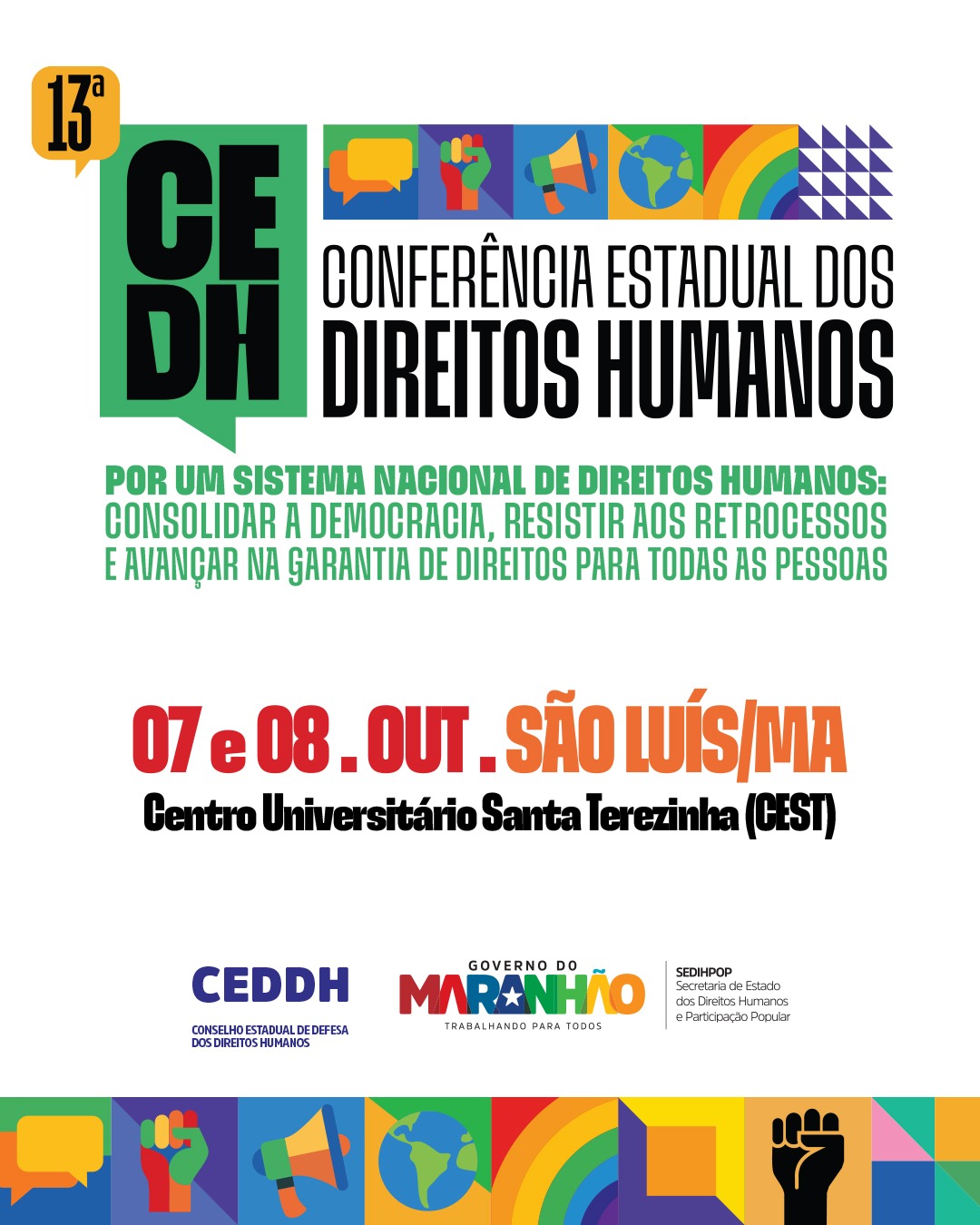 Nos dias 7 e 8 de outubro, São Luís recebe a 13ª Conferência Estadual dos Direitos Humanos (13ª CEDH), no Centro Universitário Santa Terezinha – CEST (Av. Casemiro Junior, 12 – Anil), um espaço de diálogo e construção coletiva sobre políticas públicas de direitos humanos.
