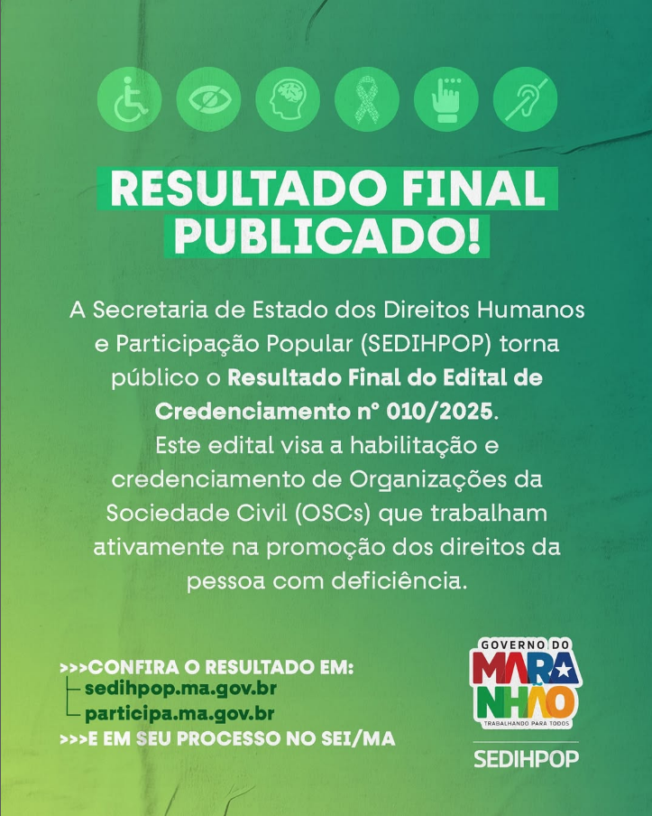 RESULTADO FINAL – EDITAL DE CREDENCIAMENTO Nº 10/2025 – SEDIHPOP A Secretaria de Estado dos Direitos Humanos e Participação Popular –SEDIHPOP, por meio da Comissão de Credenciamento e Seleção, torna…