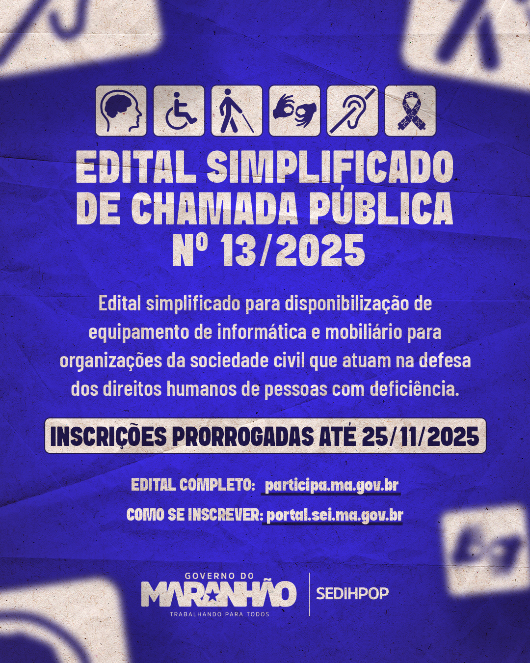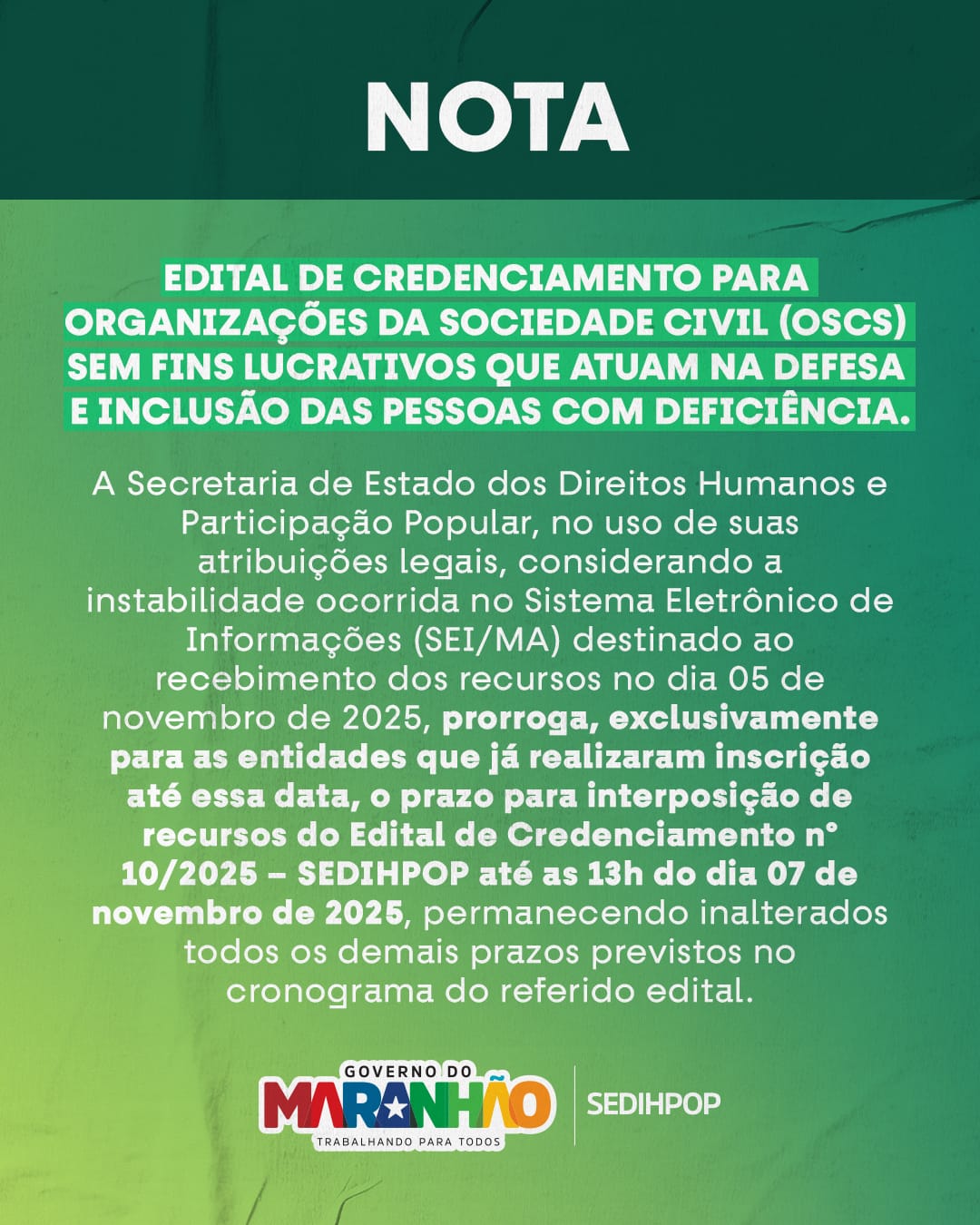 Considerando a instabilidade ocorrida no Sistema Eletrônico de Informações – SEI/MA, destinado ao recebimento dos recursos no dia 05 de novembro de 2025, a SEDIHPOP prorroga, exclusivamente para as entidades…
