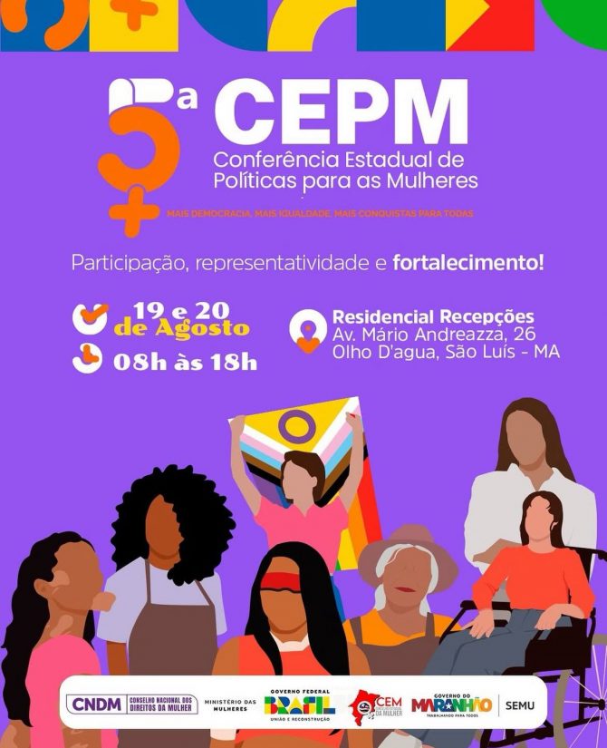5ª Conferência Estadual de Políticas para as Mulheres Local: 📍 Residencial Recepções – Avenida Mário Andreazza 📅 19 e 20 de agosto 🕗 Das 8h às 18h